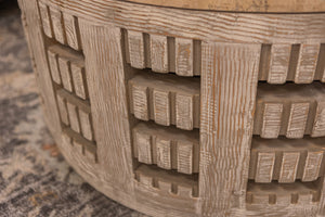 - The Denali Reclaimed Pine Coffee Table brings a rustic yet contemporary charm to any living space. Crafted from reclaimed pine, its round design features intricate carved detailing that adds texture and visual interest. The distressed finish highlights the wood’s natural character, making each piece unique. Perfect as a statement centerpiece, the Denali Coffee Table combines functionality with artisanal appeal.